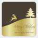 Elegant gold Christmas illustration featuring a golden silhouette of a reindeer and tree with Merry Christmas greeting on a brown background.