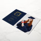These simple and elegant graduation thank you cards feature a gold foil crest with your monogram in the centre, and modern gold foil text on a dark, navy blue background. There is a spot to add your grad photo, plus room for a personal message on the back. A classy and modern look for the graduate.