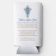 A beautiful can cooler memorial keepsake for funerals, celebration of life gatherings or to send to friends and family in honor of someone they lost. You can add a photo in the personalized area. The back has a religious poem for comfort to remind you your loved one is in God's arms now. The accent colors used are blue and gold. There is a golden cross with blue flowers on it too.