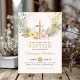 Inviting guests to your baby's Christening or Baptism? A beautiful, golden cross sits among watercolor yellow and pink flowers at top with wisps of greenery like wings. A round, white background highlights the golden cross.