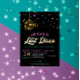Disco themed bachelorette party invitation in gold and black with neon coloured stars and flares. The bachelorette's last disco invitation in neon colours and gold foil.