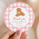 Wrap up her One Golden Year with puppy cute gratitude. This round sticker pairs a hand-drawn golden doodle and pink gingham border with an editable thank you message—perfect for sealing favor bags, gifts, or envelopes after your girl’s first-birthday pawty. Just swap in the name and date, peel, and stick for an easy dose of dog loving charm.