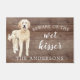 Funny beware of the wet kisser"  Golden Doodle Dog door mat set on a rustic faux background.  Visit our shop to view a large assortment of dog breads