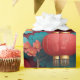 The background is adorned with two captivating "Chinese lanterns" on either side, adding a touch of tradition and festivity. The dragon seems to emerge from the card, surrounded by a vibrant array of colours – blue, pink, and red flowers that create a harmonious and visually striking scene.
