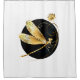 Artistically painted, gold, jewellery, sparkling dragonfly with detailed, filigree wings on golden wild flower, against black textured circle. Golden dragonfly.