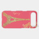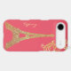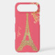 Glam iPhone 6 Plus case, with a glitzy looking gold tone glitter looking silhouette of the Eiffel Tower, against a coral pink background. Personalise the yellow gold text, for yourself or as a great gift idea.