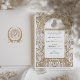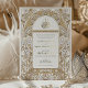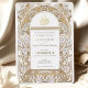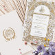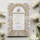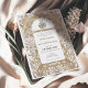 This exquisite Islamic wedding invitation card exudes elegance with its Art Nouveau-inspired design, featuring a faux gold and white colour scheme that adds a touch of luxury and sophistication. The front of the invitation showcases an intricate pattern of golden swirls and white florals surrounding a beautifully scripted Arabic Bismillah in a calligraphic style. The back of the card maintains the same colour palette for consistency, with a minimalist approach that highlights the monogram of the couple's initials. This invitation is perfect for couples looking to blend traditional Islamic values with the timeless beauty of Art Nouveau design for their wedding day.