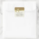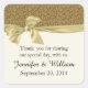 Elegant cream wedding favour stickers, with graphics of a gold tone ornate swirly pattern, on top, with a light gold satin looking ribbon and bow, below it. Personalise the black text for your special day. Great on your wedding favours. Matching products available.
