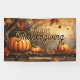 This Thanksgiving banner features a beautiful, painterly scene of a sun-drenched autumn forest. A trio of pumpkins rests on a rustic wooden log, surrounded by scattered leaves in warm, earthy tones. The elegant "Happy Thanksgiving" script and customisable family name below make this a personalised and inviting decoration, perfect for setting a cosy, festive mood.