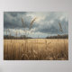 An evocative oil painting capturing the serene beauty of a vast golden field, possibly wheat or tall grass, stretching towards a distant horizon. The foreground is dominated by detailed stalks swaying gently, drawing the viewer into the scene. Above, a dramatic sky with heavy, dark clouds hints at an approaching storm, contrasting with pockets of soft light breaking through. This artwork combines the tranquillity of nature with the raw power of the elements, rendered in a textured, painterly style.