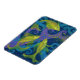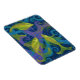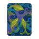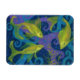 Photo magnet featuring animalist painting, three golden yellow fish in blue water, violet, turquoise and yellow seagrass and bubbles.