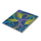 Ceramic tile featuring nautical motif, golden fishes in water streams, violet, turquoise, navy blue and yellow colours. Underwater art, pastel painting.