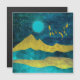 Abstract mountain landscape design in bold shades of gold, cyan,and blue with a moonrise, stars, and birds.