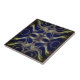 This ceramic tile design showcases an intricate and symmetrical pattern of golden, wave-like curves and swirls flowing gracefully across a deep navy blue background. The metallic gold lines intertwine seamlessly, creating an illusion of movement and depth. The elegant decoration exudes a sense of luxury and sophistication, making it an ideal choice for statement walls or artistic accents. The combination of rich blue and shimmering gold highlights the intricate craftsmanship and timeless appeal of the design