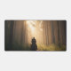 A cinematic desk mat featuring a lone rider traveling through a misty forest illuminated by warm golden sunlight. This atmospheric nature design adds adventure, depth, and calm woodland energy to any workspace.