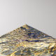 Gold, black, and blue water ripples chaotically fill the abstract photo of fountain water illuminated by late afternoon sun.