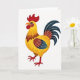 This card features a stylized rooster centered on a bright white background, drawn with sharp contours and broad areas of smooth color. Its body is golden-yellow, with a scarlet comb and wattle that echo the red of its sturdy feet, giving it a proud, affectionate “look at me” stance that can feel like a friendly wink. Rich browns and deep blues shape the neck and wing feathers, adding depth while keeping the overall look simple and graphic. The tail fans outward in curved plumes of indigo and russet, each one traced with a light edge that reads like a gentle touch between close friends. A short Easter greeting sits near the top in a soft gray tone, with a smaller line beneath it in muted red, leaving plenty of open space around the bird 🌷. The clean backdrop makes the colors stand out and keeps the focus on the rooster’s confident pose 🐇. The indigo tail feathers arc to the right in layered curves, with thin highlights following each plume’s sweep.