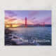 Welcome to San Francisco, California! This fun California postcard features a glorious sunrise over the San Francisco bay with the Golden Gate Bridge in the background