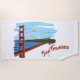 A towel for anyone who loves San Francisco: this design features a whimsical illustration of the Golden Gate Bridge with San Francisco Bay and the city in the background. A yellow plane flies above the bridge towing a banner with the text "California" and an image of the bear from the state flag. The text "San Francisco" appears in the bottom right in a playful, orange font outlined in black.