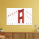 A close-up photograph captures the iconic red tower of the Golden Gate Bridge. The tower's intricate structure is visible, with its vertical supports and horizontal beams. The bridge's suspension cables, made of numerous thin wires, extend from the tower, creating a pattern of vertical lines against the white background.