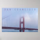 The image shows a partial view of the Golden Gate Bridge, heavily obscured by fog. The bridge's red-orange structure is visible, particularly the towers and the road deck. The fog is dense and white, enveloping the upper portions of the bridge and creating a misty atmosphere. The bridge's suspension cables are visible, disappearing into the fog.