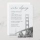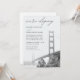 Capture the beauty of San Francisco and invite your guests in style with this black and white Golden Gate Bridge elopement reception invitation. The front showcases a bridge photo, setting the perfect tone for your wedding day. Customise the text to make it your own and enter the Zazzle design tool for further customisation. Compare paper types to select your favourite and pair with coordinating details, rehearsal, and RSVP enclosure cards.