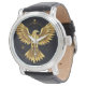 A stunning image of a golden, intricately designed geometric eagle with outspread wings, positioned against an abstract dark background with mystical patterns. Ideal for themes of strength, power, and freedom.