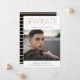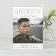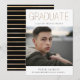 Golden type "GRADUATE", photo graduation announcement. Back of card features golden stripe pattern on classic black background.