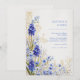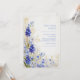 This elegant design features a lush corner arrangement of vibrant blue muscari and delicate daisy-like wildflowers. The deep cobalt and periwinkle tones of the grape hyacinth are beautifully contrasted by shimmering golden-brown grass accents and ethereal white blossoms. Set against a soft cream-textured background, the illustration offers a sophisticated, fine-art feel with a focus on intricate botanical textures. It captures the serene beauty of a wild spring meadow, bringing a romantic and polished touch to your stationery. This botanical layout is a premier choice for a spring meadow wedding or a whimsical outdoor ceremony. The unique combination of cobalt blue and warm gold accents makes it exceptionally suited for an elegant garden bridal shower, a sophisticated morning engagement party, or a country estate rehearsal dinner. It pairs effortlessly with wedding palettes featuring navy blue, mustard gold, sage green, or classic cream, offering a refined look for couples seeking a modern-vintage or fine-art aesthetic.