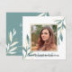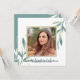 Simple and classy, these elegant graduation invitations are the perfect way to celebrate the newly graduate. Features green watercolor florals, gold leaves, and a gold border that surrounds a photo template. The back is green with white and gold floral. All green, grey, and white text is customisable.