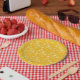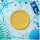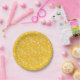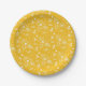Honey bees fly between flower blossoms on a golden yellow background for a baby shower, garden party or children's birthday celebration.
