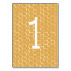 Organic, transparent brush strokes in a white honeycomb pattern, on golden yellow. Choose your own background colour. Personalise by changing the table number on both sides. Available in invitations too!