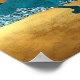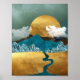 A striking abstract landscape poster featuring a golden sun rising behind bold blue mountains, contrasted with shimmering textures and flowing golden fields. White birds soar across the cloudy sky, adding movement and serenity to the scene. The composition blends natural and surreal elements, creating a modern, luxurious aesthetic that feels both calming and powerful. Perfect for lovers of bold colour contrasts and contemporary nature-inspired art.