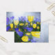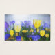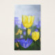 Sunny yellow and blue tulips stand out in a field on a cool, misty spring morning. In the early sunlight they stand out like golden cups of light.