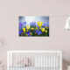 Sunny yellow and blue tulips stand out in a field on a cool, misty spring morning. In the early sunlight they stand out like golden cups of light.