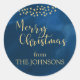 A midnight blue round sticker is embellished with golden stars and script font typography saying "Merry Christmas" in the same shade of gold. Customise with your name on the easy-to-use template. The 1.5 inch sticker was designed as an envelope seal, but you could also change the style to a 3-inch sticker to use as gift tags on your wrapped presents. Part of the "Golden Light of Christmas" collection. #holidayZ