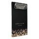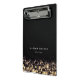 Chic black clipboard features two lines of custom text in modern white lettering, accented by crisscrossing strands of gold string lights with a blurred bokeh effect. Design repeats on reverse side. Please note that this clipboard is a mini size; full size version also available in our Golden Lights collection.
