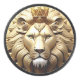 Detailed artistic depiction of a regal lion adorned with a crown on a circular golden emblem, representing strength, nobility, and royal authority.