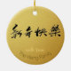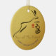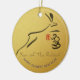 Original ink painting style of a bouncing rabbit by RB + black "2023" (original hand writing) + small ancient Chinese ideogram for rabbit in a red shape+ customisable "Happy Chinese New Year" and golden "Year of the Rabbit" onto a golden textured paper (image printed) as background + wishes in Chinese and message with Family name to customise in back. You can easily change "Happy Chinese New Year" (font, colour, size and position) by clicking the customise button. Design on round ceramic ornament. Matching greeting card, holiday postcard, sticker and more... Perfect for Chinese New Year of the Rabbit 2023 or birthday (people born in Rabbit Year).