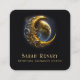 A beautiful golden crescent surrounds a celestial full moon. On back lunar moon phases in a gold texture. Perfect for psychic mediums, yoga teacher, spiritual coach, crystal worker, energy healers and so much more. Customise with your business details and information.