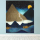 An abstract landscape with unique colours and textures showing a nigh time mountain scene with the glowing lights of climbers and a moon in shades of blue, gold, cyan, and yellow.