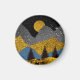 Abstract mountain landscape design in bold shades of gold, black, and blue with a moonrise and birds.