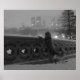Dry-brush effect rendering of a photograph of my Golden Retriever on Bow Bridge in Central Park during a snowstorm. The New York City skyline can be seen in the distance.