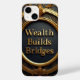 This striking design features the phrase "Wealth Builds Bridges" elegantly displayed in shimmering gold. The text symbolises the transformative power of wealth, suggesting that it fosters connections, opportunities, and collaboration. The background, subtly textured, enhances the golden lettering, inviting viewers to reflect on the ways prosperity can unite diverse communities and create lasting relationships.