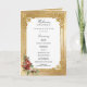 Create an unforgettable winter wedding with this elegant holiday folded program design featuring a lush spray of Christmas roses, poinsettia, holly and pine, white label with an ornate gold border and an opulent faux metallic gold gradient damask pattern background. Inside features a photo template.