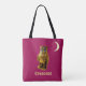 Golden owl and crescent moon on burgundy background tote bag. Text can be personalised.