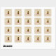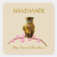Golden owl handmade sticker. The golden owl is standing on a blooming tree branch on beige background. Text is ready to be personalised.