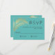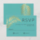 A wedding RSVP card In beautiful elegant minimalist style featuring a single golden faux foil palm frond over a Caribbean blue background. A contemporary style sans serif type face is used to compliment the contemporary style of the design. This response card is a wonderful choice for beach weddings, destination weddings or weddings with a tropical theme.