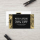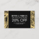 Coordinates with the Golden Palms Spray Tanning Salon Logo on Black Business Card Template by 1201AM. A modern and simple logo of palm leaves are silhouetted within a hexagon shape containing your name or business name on this customisable referral card template. Set on a black background for a glamourous aesthetic. Perfect for tanning salons, waxing salons, tropical or coastal beauty salons/spas, and more. Update the promotion for your own unique offering. Art and design © 1201AM CREATIVE