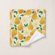 A pattern of vibrant golden-brown pears in shades of yellow, orange and gold, with deep green leaves. Some of the pears are halved to show the juicy insides and seeds. This pattern is clean and modern, using simplistic fruit illustrations paired with watercolour textures and a limited colour palette.